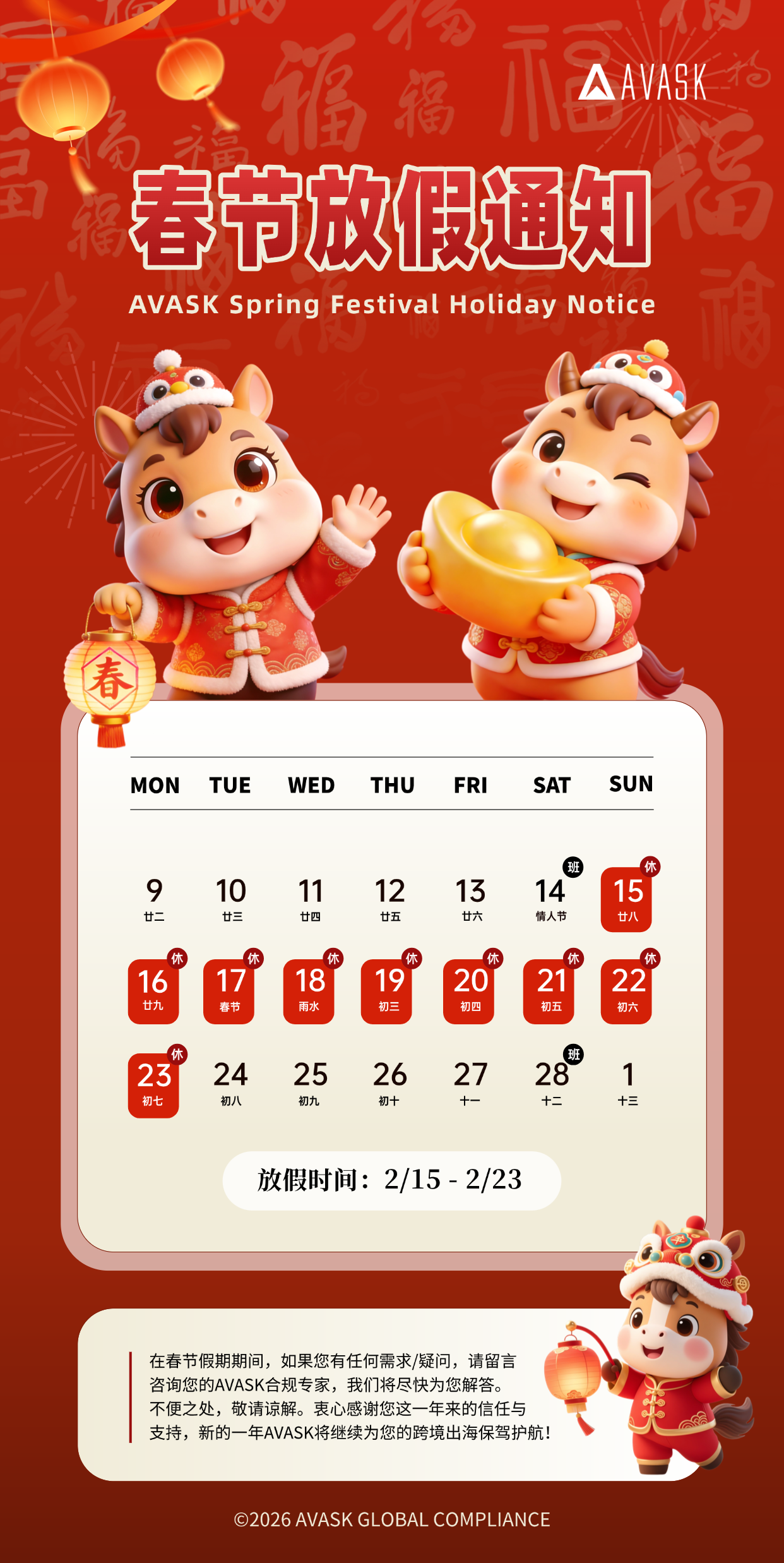 通知 | AVASK中国2026年春节放假安排来啦 来源:思达税 发布时间:2026-01-01 根据AVASK集团的统一工作部署,AVASK中国2026年春节放假安排如下:放假时间:2月15日至2月23日,共9天上班时间:2月24日(星期二)起正常上班如遇紧急合规事宜,请您发送邮件至:cn.compliance@avaskgroup.com,我们将尽快与您联系。春节期间,AVASK海外团队将照常为您提供服务,确保合规无虞。放假期间给您带来的不便,敬请谅解。祝您新春愉快,马年大吉,阖家幸福! 上一篇: 无 下一篇: 官宣!英国商标专利官费暴涨25%,卖家务必在3/31前完成这3件事! 返回列表
