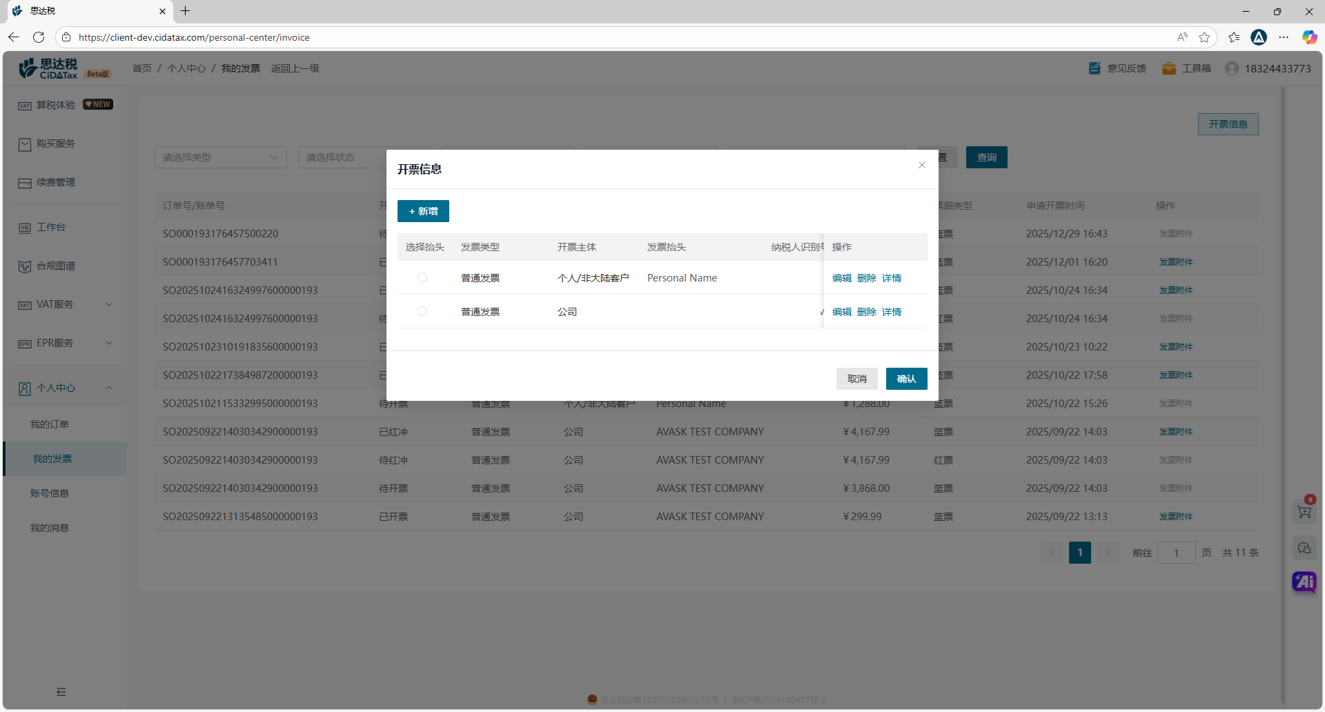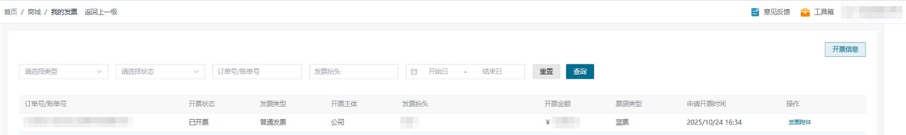 我的发票 点击【个人中心】-【我的发票】,您可在此管理您的发票信息,包括新增发票、修改发票、删除开票信息等。 已开票完成后,可在此下载为您开具的发票 同时,在管理您的开票信息时,也可快速选择发票抬头,避免重复的信息提交